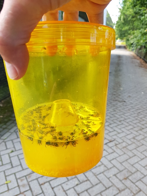 - Once the wasp flies into the trap, from where it is unable to escape, it will quickly drown in the liquid.