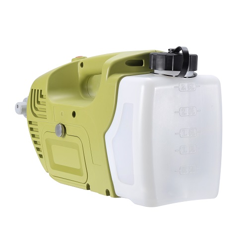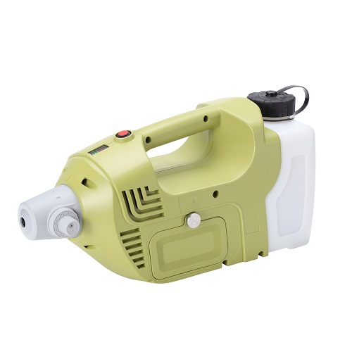 The portable ULV cold fogger uses a battery as power to drive the fan to generate high-speed rotary cutting airflow, and at the same time pressurize the chemical at a certain flow rate (adjustable) to the confluence of the nozzle and the high-speed airflow. Under the combined action of the structure, the chemical is broken into extremely small fog particles. Due to the extremely small diameter of the fog particles (as small as 50 microns), the appearance is like water mist, so that the fog particles have strong dispersion, uniformity, floatability in space. It can be suspended for a long time and has a continuous disinfection and sterilization effect on the air. The protection range is large, so that the chemical can fully play its role. Not even living flying